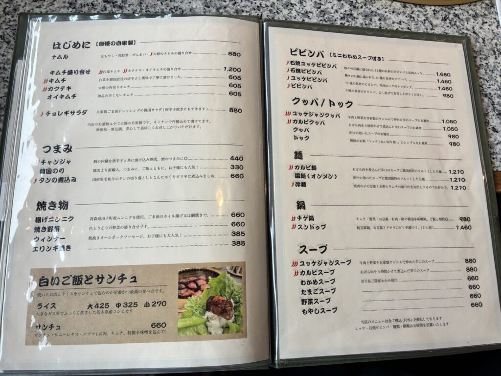 ランチセットのご飯、スープ、サラダ、ナムル、キムチはこんな感じ。